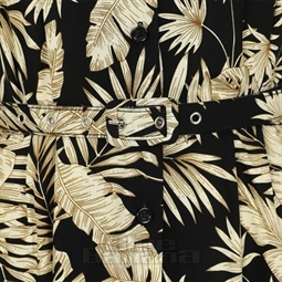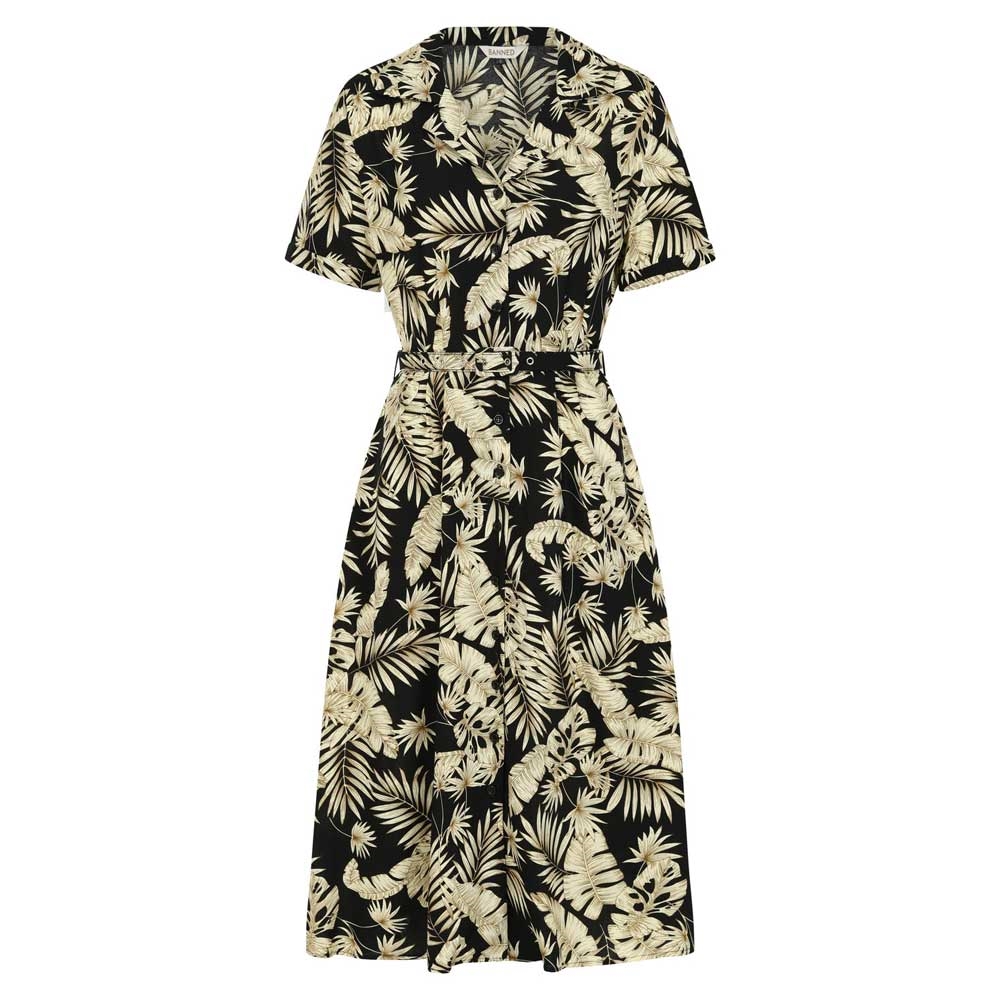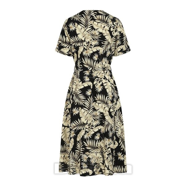 Black Yvette skjortekjolen er en flot 40er-inspireret bomuldskjole i klassisk sort med flot tropisk print. Den har en åben halskrave, knapper foran, korte ærmer med opsmøg, matchende bælte og så har den har lommer i sidesømmen.