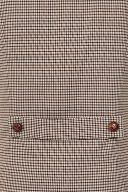 Houndstooth-vest i sort og brun med en brun baggrund. Denne vest har knaplukning foran med brune knapper og er foret med satin.