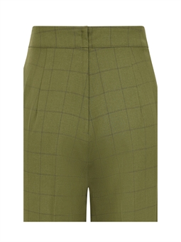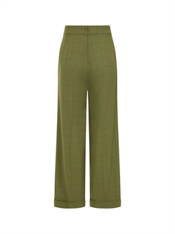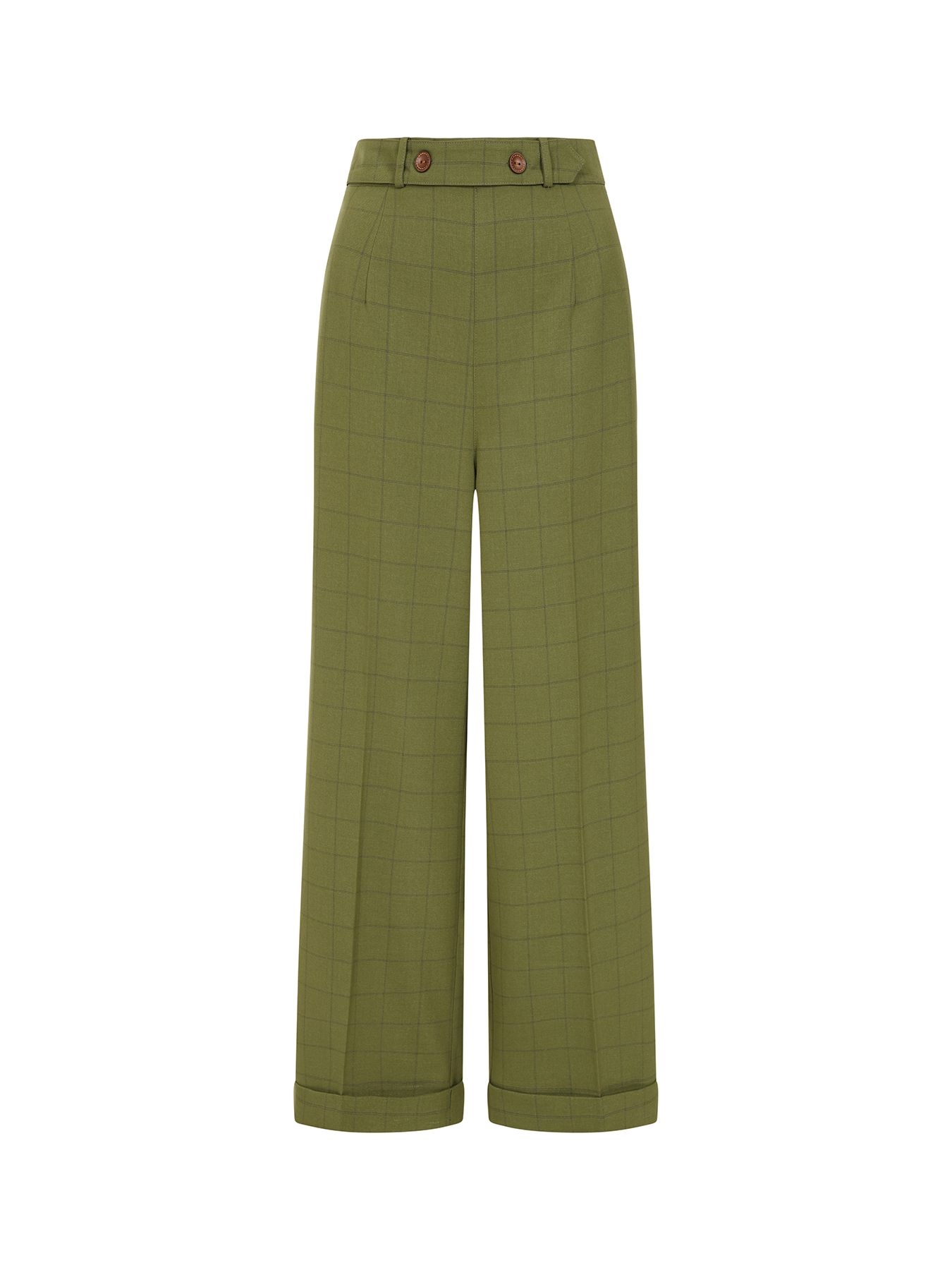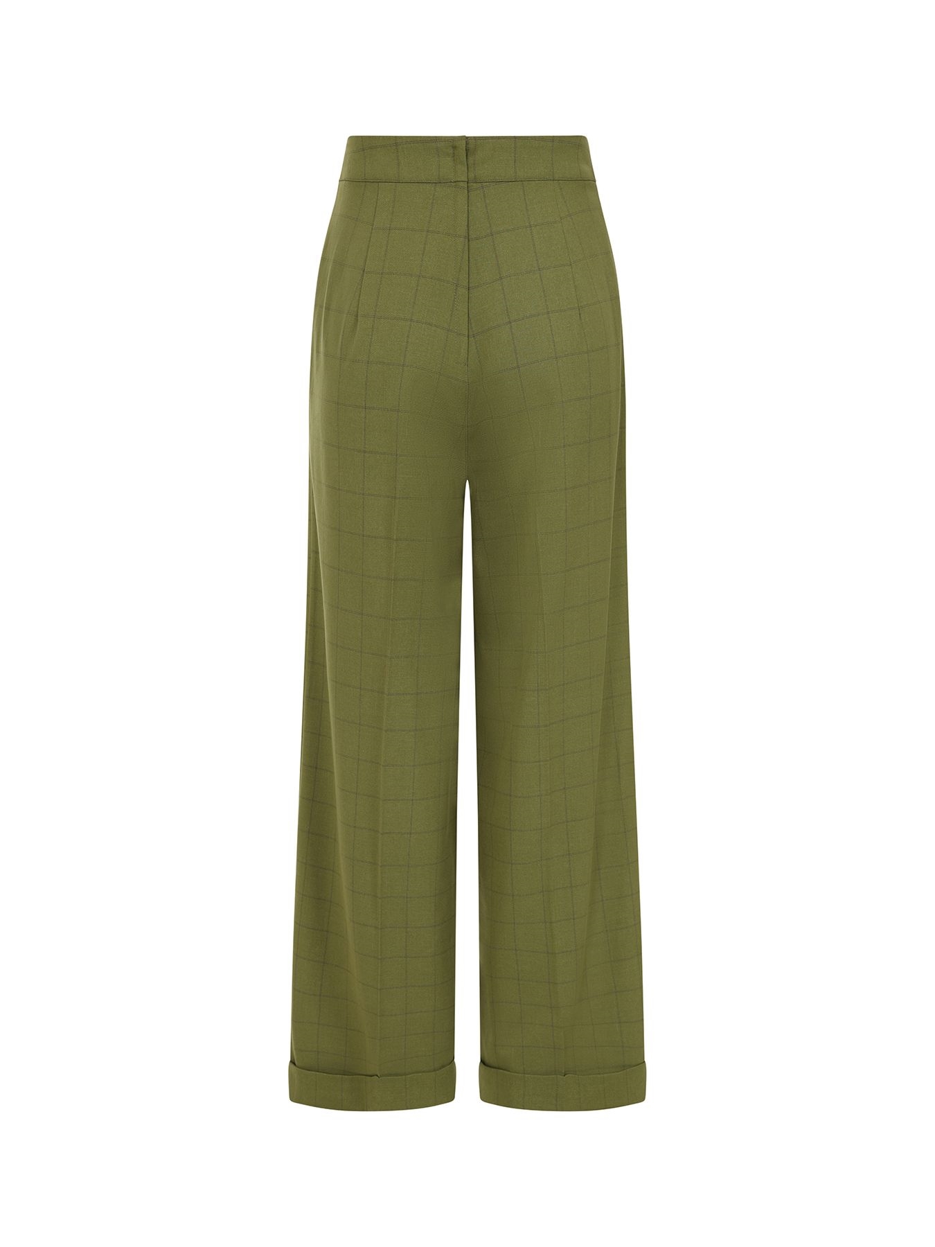 Disse karakteristiske højtaljede vævede bukser fra Banned Retro er inspireret af 1950'erne. De har en funktionel frontflig og lynlåsåbning med to smukke træknapper og sidesømlommer. Det varmende, vævede, bløde, grønne tern føles luksuriøst. Perfekt til formelt brug eller afslappet hverdagsbrug.
