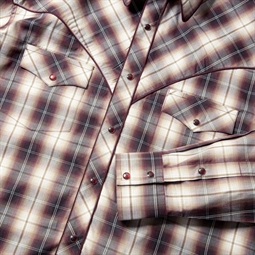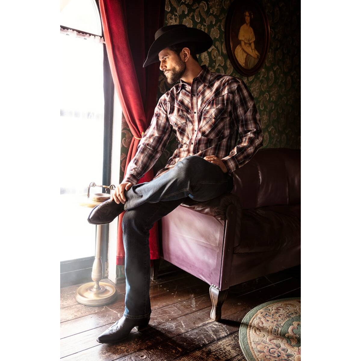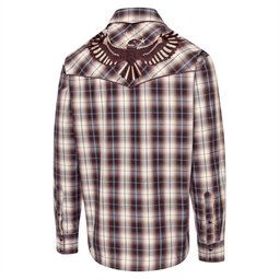 Denne westernskjorte har et slående ternet mønster i afdæmpede farver med en detaljeret broderet ørn på ryggen. Det typiske westernmærke, de påsyede brystlommer og perlemorstrykknapperne sikrer autentisk cowboycharme.
