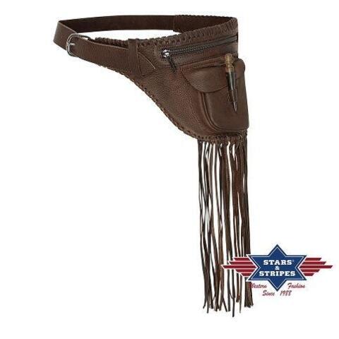 Lårtaske i okselæder med frynser og udvendig påsyet lomme med dekorativ sabeltand. Den er alsidig og kan også bæres som crossbody- eller skuldertaske. Fås også i sand eller brun.